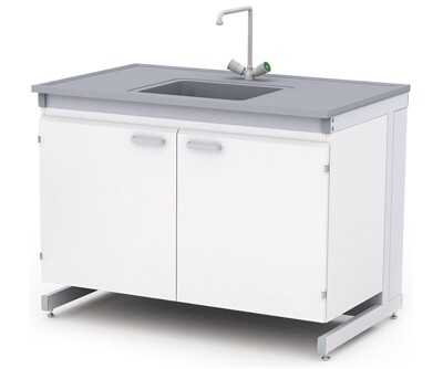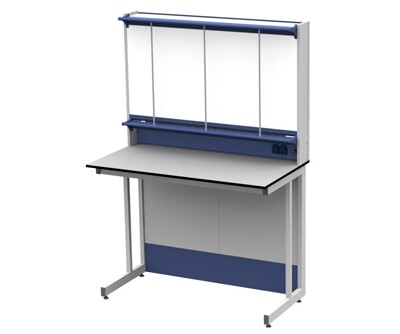 Каркас из металлического профиля , окрашенного порошковой краской (цвет RAL 7035). Материал столешницы - TRESPA TopLabPlus 16 мм