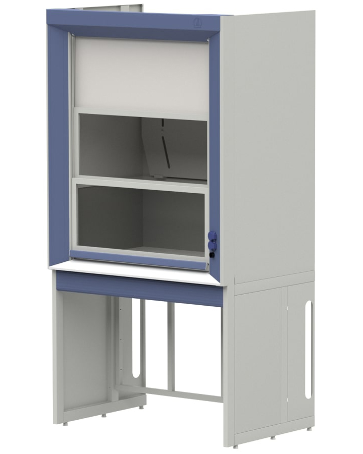 - один подъемный экран – закаленное стекло в раме из алюминиевого профиля, подъем 0-670 мм, не изменяет габариты шкафа при подъеме. Экран при подъеме заходит в пространство между верхним внешним неподвижным экраном шкафа и козырьком рабочей капсул, что исключает воздействие паров кислот на тросы подвижного экрана.